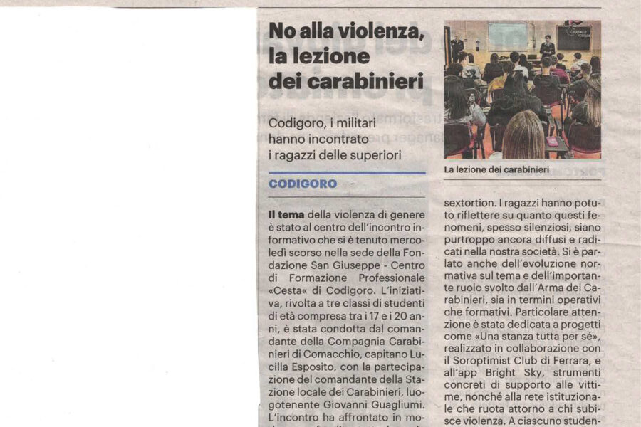 No alla Violenza, una lezione con i carabinieri News No alla Violenza, una lezione con i carabinieri A Codigoro i militari hanno incontrato i ragazzi della Fondazione San Michele Arcangelo per una…Amministrazione CFP Cesta13 Maggio 2025