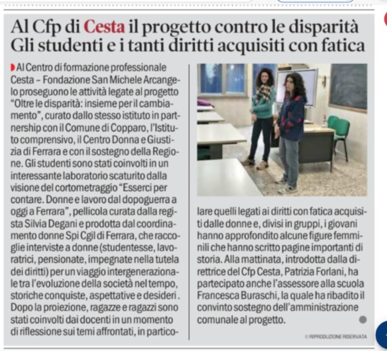 Recentemente, i nostri studenti sono stati coinvolti in un laboratorio di riflessione estremamente stimolante, partito dalla visione del cortometraggio “Esserci per contare. Donne e lavoro dal dopoguerra a oggi a Ferrara”. La pellicola, curata dalla regista Silvia Degani e prodotta dal coordinamento donne Spi Cgil di Ferrara, ha offerto uno spaccato intergenerazionale sull’evoluzione della figura femminile nella società e nel mondo del lavoro.